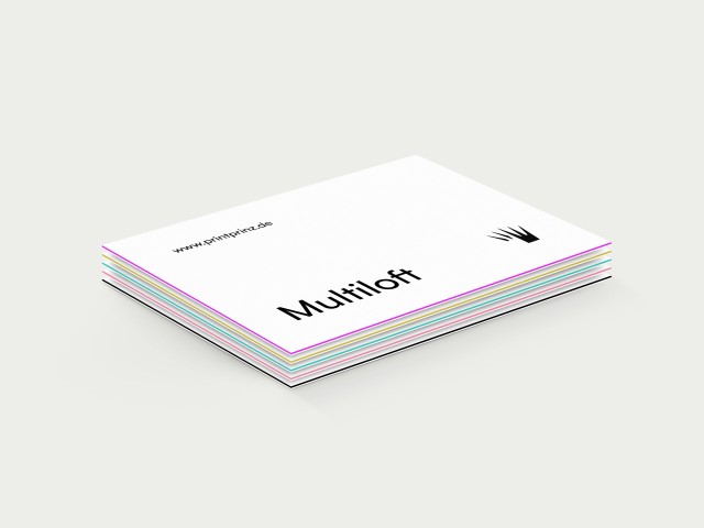 Mit unseren Multiloftkarten haben Sie eine gute Entscheidung getroffen, wenn Sie etwas besonderes mit möglichst viel Gewicht suchen. Ganz egal ob als Visitenkarte, Flyer oder Grußkarte. Jede Einsatzmöglichkeit und jedes Format sind möglich. Das besondere bei diesem Produkt ist ohne Zweifel der Farbkern, den Sie einfach oder doppelt wählen können. Wir bieten Ihnen für den Farbkern insgesamt 13 Varianten an zwischen denen Sie wählen können: Magenta, Rosa, Rot, Schwarz, Elfenbein, Weiß, Olivgrün, Hellgrün, Türkis, Lila, Blau, Gelb, Orange. Und wenn das noch nicht genug ist, dann runden Sie Ihre Multiloftkarten mit einer Vielzahl unserer Veredelungstechniken ab. Wählen Sie dabei gerne aus Folienkaschierungen, partiellem UV-Lack oder Heißfolienprägungen. Bei den Multiloftkarten mit Veredelung setzen wir produktionsbedingt eine glatte Oberfläche ein.