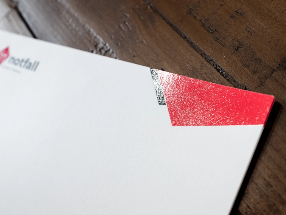 Dieses Briefpapier mit UV-Lack ist nicht nur haptisch, mit seinen 160g DesignOffset 1.2 naturweiß ein Knaller, sondern auch durch die knallige Pantonefarbe 192 und dem echt fetten Lack! Dieser ist mit einem groben Sieb so fett aufgetragen, dass Glanz und Erhabenheit deutlich sichtbar sind.