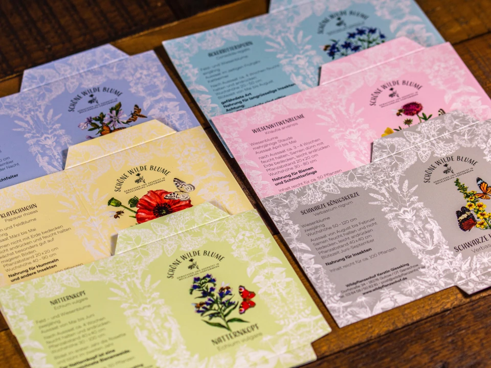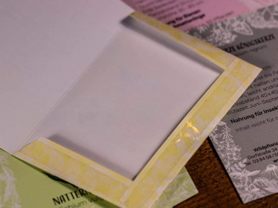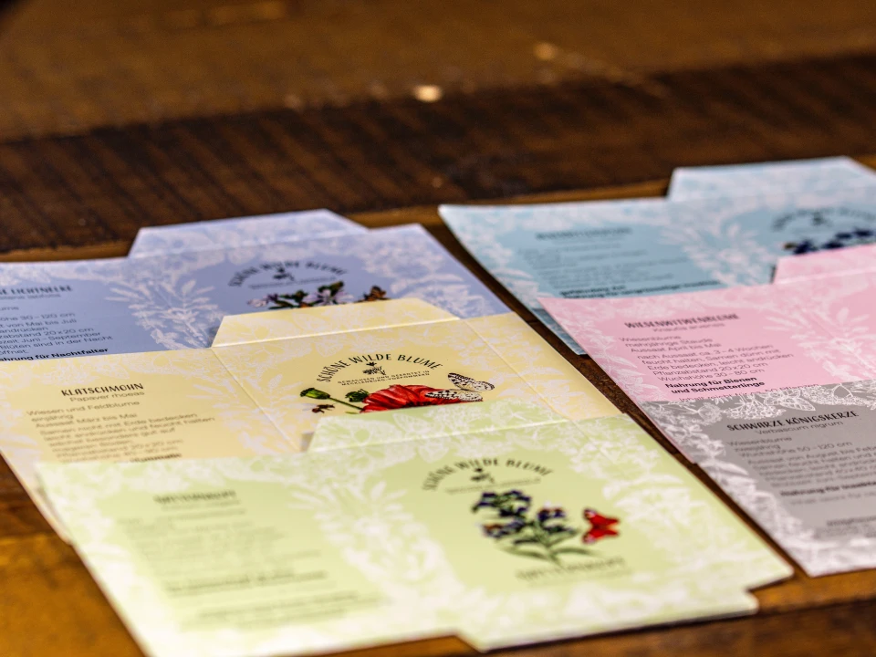 Egal ob lose Blätter, Blumensamen oder Produktproben – machen Sie sich das Leben nicht so schwer. Sie sehen hier eine von vielen Möglichkeiten, wie Sie Ihre Verpackung als optischen Knaller darstellen, jedoch produktionstechnisch und wirtschaftlich eher kostensparend unterwegs sind. In diesem Beispiel produzierten wir Blumensamentüten auf dem FSC-zertifiziertem Recyclingpapier Circlesilk Premium White von Igepa. Um daraus eine Verpackung zu fertigen stanzten wir den 115g Karton und verklebten ihn.