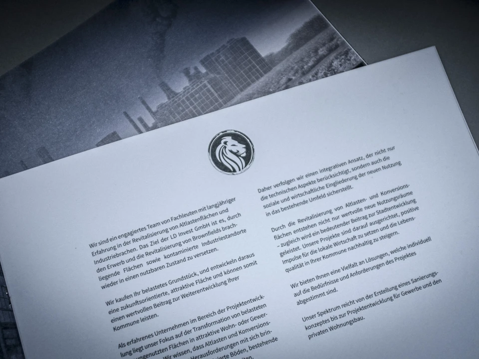 Für die LD Invest GmbH aus Delbrück haben wir eine hochwertige Imagebroschüre im DIN A4-Querformatproduziert – mit starker Wirkung auf den ersten Blick und beim ersten Anfassen.