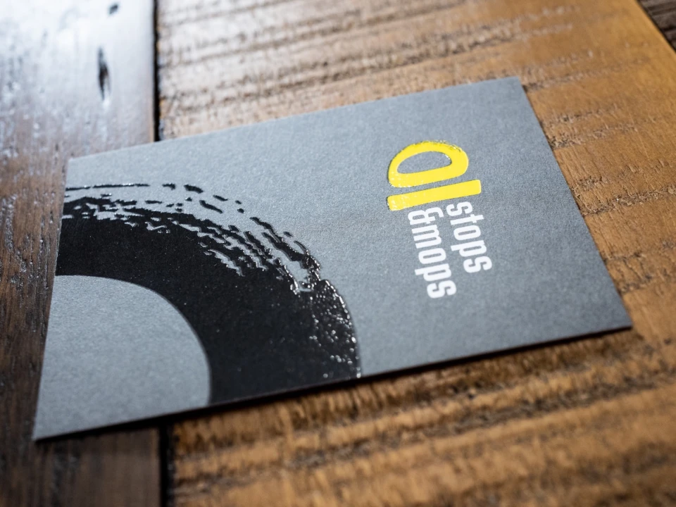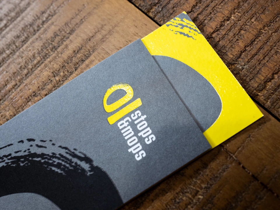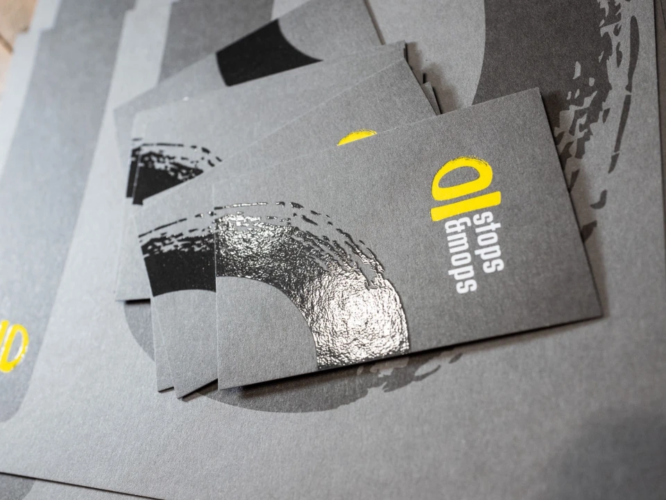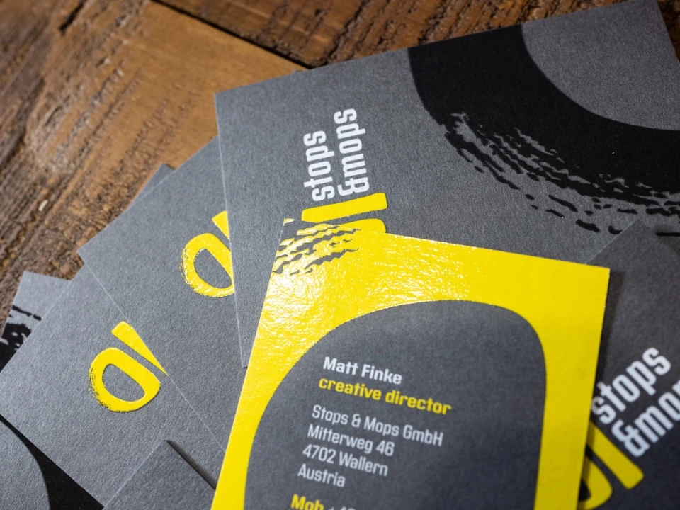 Unser heutiges Beispiel setzt auf Pantone 106 in Kombination mit einem 100% Schwarz und einem 75% gerasterten Schwarz. Trotz des sehr haptischen Arena rough white 300g von Fedrigoni, sticht die grelle Pantonefarbe hervor. Auch das gerasterte Schwarz wirkt in dieser Material- und Colorblocking-Variante gestochen scharf. Der zusätzlich verwendete partielle UV-Lack setzt dem Ganzen die Krone auf und überzeugt auch den letzten Kritiker von dieser besonderen Karte.