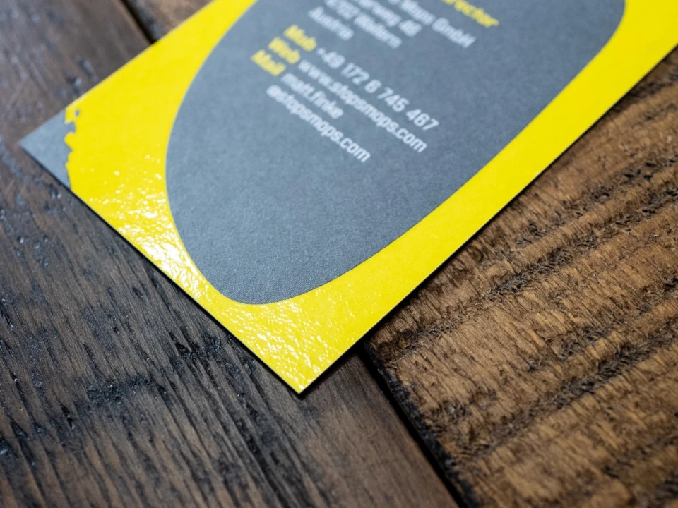 Einfach mal eine knallige Pantonefarbe bei Visitenkarten mit partiellem UV-Lack verwenden!!!