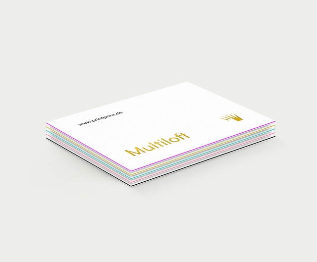 Multiloftkarten mit Heißfolienprägung kombinieren robuste Dicke mit edlem Glanz für ein luxuriöses Erscheinungsbild. Die Heißfolienakzente heben wichtige Designelemente hervor und verstärken die hochwertige Optik. Ideal für exklusive Einladungen oder Premium-Visitenkarten.